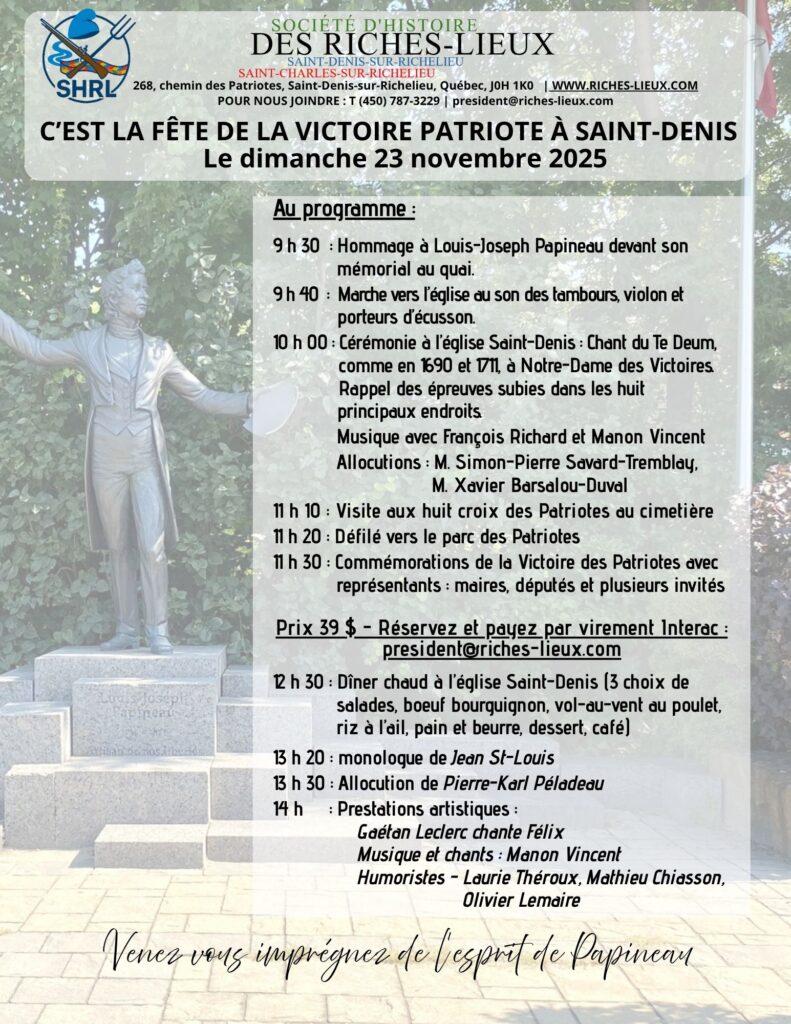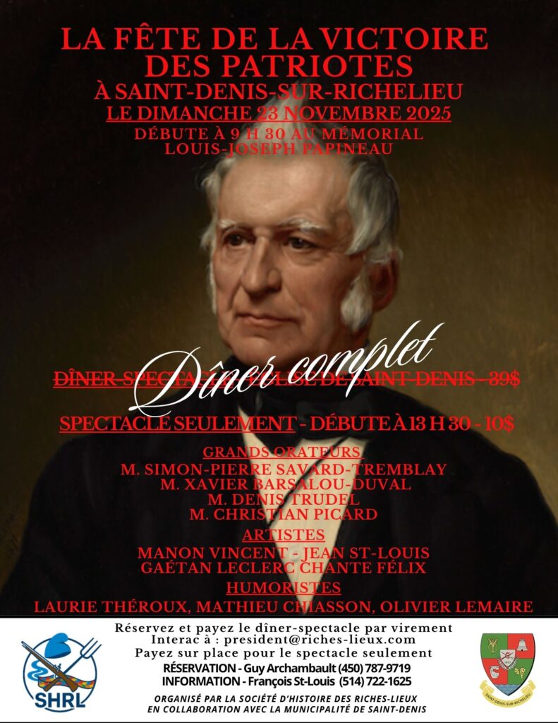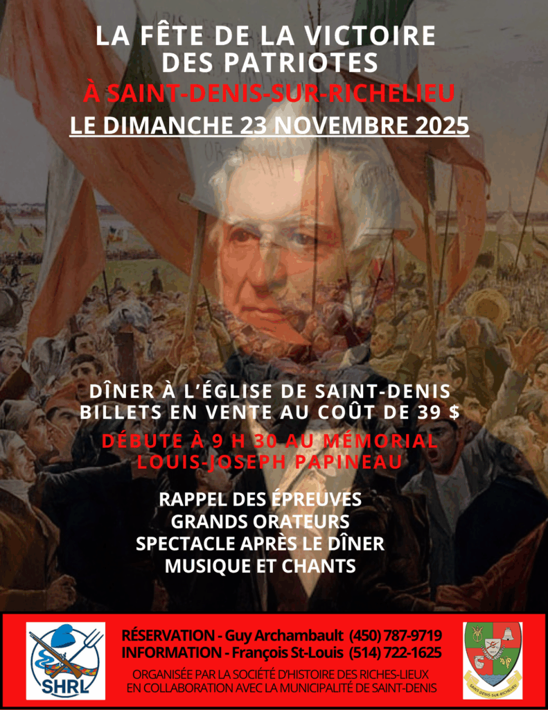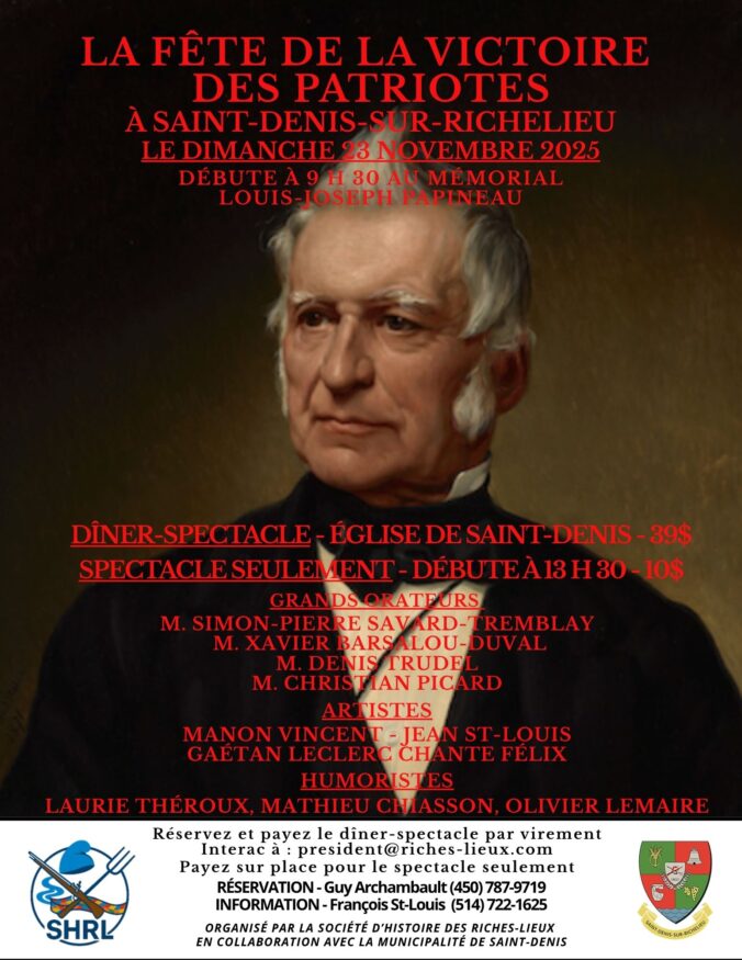 Au cours des deux derniers jours de l’événement, plusieurs billets ont été vendus pour la Fête de la Victoire des Patriotes qui se tiendra le 23 novembre à l’église de Saint-Denis. Vous pouvez communiquer avec la SHRL en tout temps pour vous procurer des billets (450) 787-9719 ou par courriel à : president@riches-lieux.com. Ne tardez pas, cette année, l’église de Saint-Denis pourrait être remplie à raz bord de passionnés(es) d’histoire pour l’occasion! Mon optimisme se veut contagieux… Hihi!