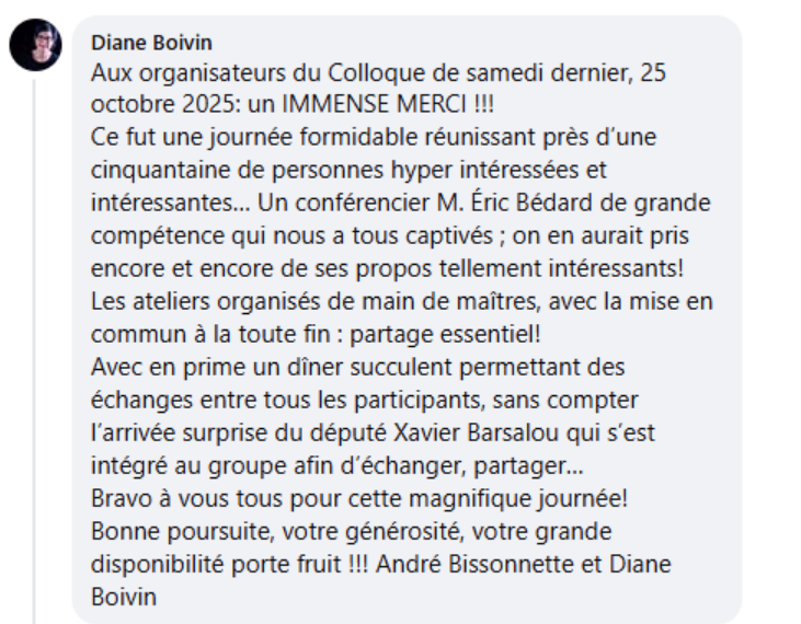Nous préparons un opus « SPÉCIAL FIN D’ANNÉE » de L’Écho, où nous reviendrons en grand sur le travail accompli en ateliers, lors du colloque, ainsi que sur la présentation d’ouverture de M. Éric Bédard.