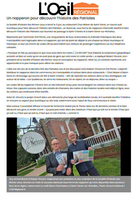 Le mercredi 11 juin 2025, au Café-bistro Chez Nelson, la Société d’histoire des Riches-Lieux a déclaré officiellement ouverte la saison de Chasse aux trésors de l’histoire des Patriotes de 1837-1838 et des municipalités de Saint-Denis et Saint-Charles.